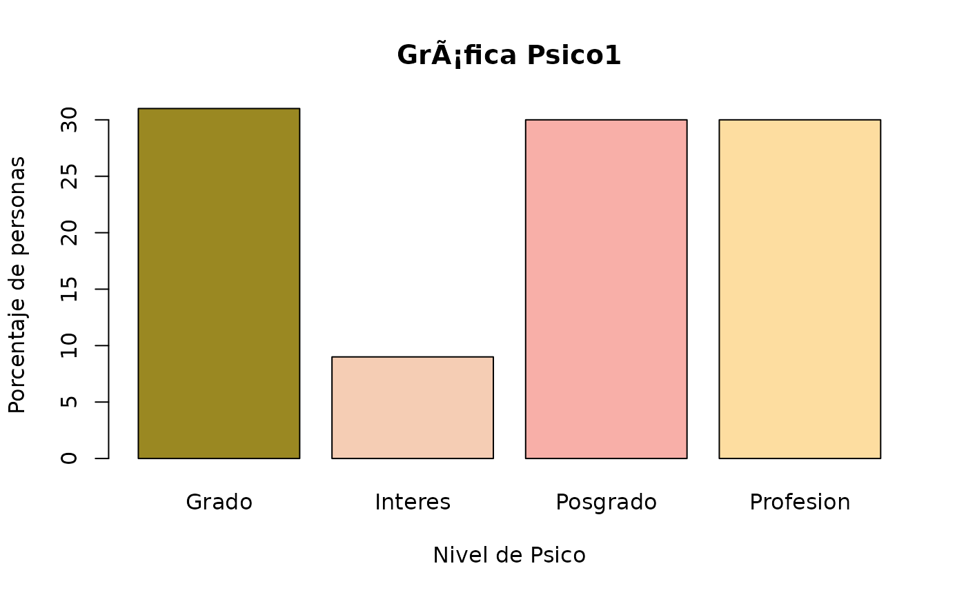 data("clima") muestrame(variable = clima["psico1"], titulo = "Gráfica Psico1", etiqueta_x = "Nivel de Psico")#> variable #> Grado Interes Posgrado Profesion #> 31 9 30 30